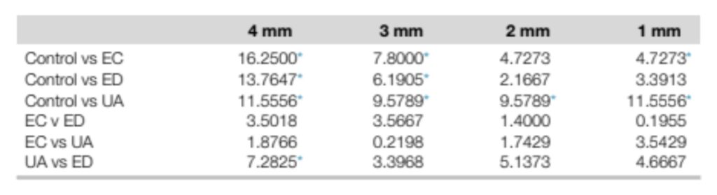 control group did not present a smear layer at any of the levels analyzed. At 1 mm, there was no significant difference between the levels of smear layer formation observed in the ED and control groups, and the results of the EC and UA groups were significantly higher than that of the control group. At 2 mm, the level of smear layer formation of the UA group was significantly higher than that of the control group, and there were no significant differences among the EC, ED, and control groups. At the 3- and 4-mm levels, all of the experimental groups had significantly higher levels of smear layer formation than the control group. All of the experimental groups at all of the apical levels analyzed presented a smear layer (Tables 1 and 2).