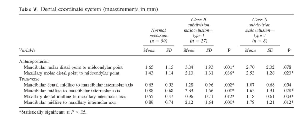 Anteroposteriorly, type 1 patients had greater asymmetry of the molars than did those in the normalocclusion group. Greater asymmetry of the mandibular molars was expected because of the nature of Class II subdivision in this type, but not of the maxillary molars. This demonstrates that there might also be slight contribution of the maxillary molars to the asymmetry in this malocclusion type.23 On the other hand, type 2 seems to have symmetrical mandibular-molar anteroposterior positioning and asymmetrical maxillary-molar anteroposterior positioning, in relation to the normal