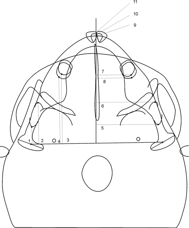 between dental maxillary midline and X-line; 8, mandibular dental midline deviation—horizontal distance between dental mandibular midline and X-line; 9, frontozygomatic suture to X-line distance—horizontal distance between frontozygomatic suture and X-line; 10, condylion to X-line distance—horizontal distance between condylion and X-line; 11, zygoma distance—distance between zygomaxillary arch and X-line; 12, pyriform aperture to X-line distance—horizontal distance between lateral wall of pyriform aperture and X-line; 13, maxillary buttress to X-line distance—horizontal distance between maxillary buttress and X-line; 14, antegonial notch to X-line distance—horizontal distance between antegonial notch and X-line; 15, maxillary first molar height—vertical distance between maxillary buttress and buccal cusp tip of maxillary first molar; 16, condylion to antegonial notch distance—size of mandibular