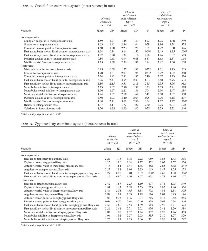 would be expected for a molar, the level of significance was greater than for the other type. Tables III and IV show significantly greater anteroposterior asymmetry for only the mandibular molars in both types of subdivision malocclusions in relation to normal occlusion. This means that the primary characteristic of type 2 subdivision malocclusion (asymmetry of the maxillary molars) did not manifest in this evaluation and that, in this type, asymmetry of the mandibular molars also plays an important role, as previously shown.23 This could be because of the small number of subjects in this malocclusion type, requiring subsequent investigations with a larger sample. Skeletally, in the zygomaxillary coordinate system, there was greater asymmetry of the