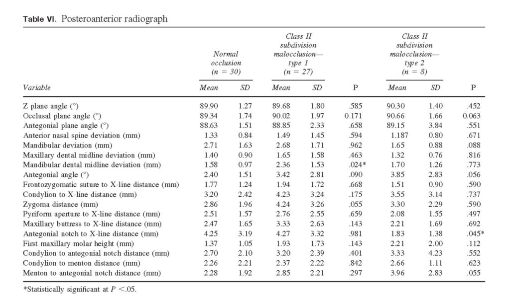 differences between percentages was used to compare the distribution of types in the sample. Independent t tests were used to independently compare the radiographic dentoskeletal asymmetries between types 1 and 2 of Class II subdivision malocclusion with the normalocclusion group. The results were regarded as statistically significant at P .05. All analyses were performed with software (Statistica for Windows, release 5.0A, Statsoft, Tulsa, Okla).