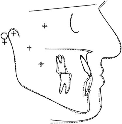 The facial photographs show improvement in the facial profile (Fig 5). The intraoral photographs and dental casts show a bilateral Class I molar and canine occlusion with normal overjet and overbite (Figs 5 and 6). Good intercuspation, interproximal contacts, and satisfactory root parallelism were achieved (Fig 7, A). The final cephalometric radiograph, tracing, and superimposition show that the maxillary incisors were labially tipped and slightly protruded, and the maxillary molars were slightly mesially displaced (Figs 7, B and C, and 8). The mandibular incisors were slightly lingually tipped and retracted. There was also an increase in upper lip projection, and the mandible underwent slight clockwise rotation. The patient was satisfied with his dental and facial appearance.