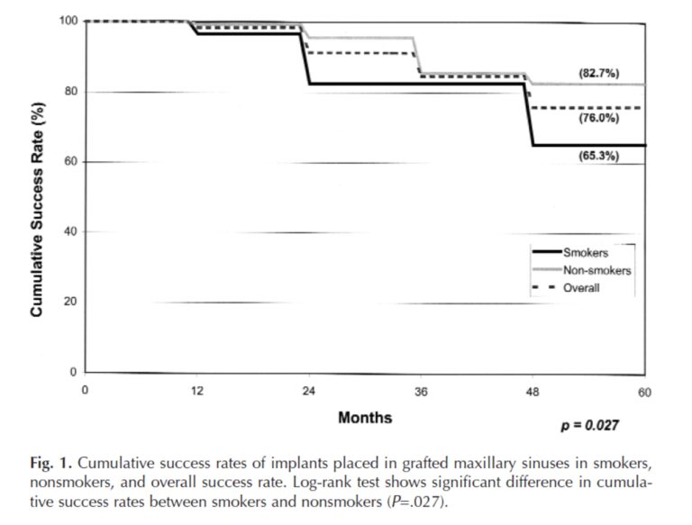 2. There were significantly higher cumulative implant success rates in non-smokers (82.7%) than in smokers (65.3%) (P=.027). The overall cumulative