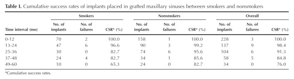 Conclusion. Within the limitations of this study, cigarette smoking appeared to be detrimental to the success of osseointegrated implants in grafted maxillary sinuses regardless of the amount of cigarette consumption. (J Prosthet Dent 1999;82:307-11.)