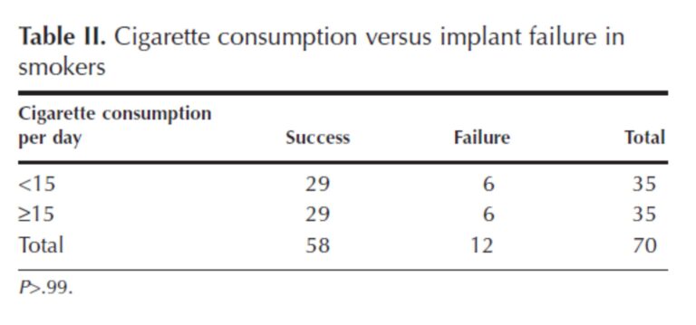 3. No correlation was noted between the levels of cigarette consumption (<15 cigarettes per day vs ³15 cigarettes per day) and implant failures in the smoker group (P>.99).