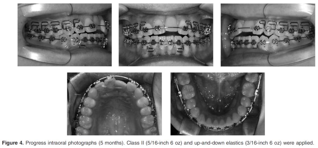 1. Open bite closed except for the maxillary left central incisor (Figure 4). All third molars were extracted before treatment. The maxillary and mandibular arches were bonded with .022-inch slot brackets (SmartClip, 3M Unitek, Monrovia, Calif) except for the maxillary left central incisor. After leveling, a MEAW 0.01830.022 stainless steel archwire in the maxilla and an ideal arch (0.019 3 0.025 stainless steel) were ligated in the mandible. Class II (5/16- inch 6 oz) and up-and-down elastics (3/16-inch 6 oz) were applied to retract and extrude the maxillary anterior teeth. Dr. Kim’s original method used a 0.016 3 0.022 wire in a 0.018 slot for MEAW,28 but the authors used a 0.018 3 0.022 wire in a 0.022 slot. This would make it more difficult to control torque because of the larger play compared with the original. However, in this case, torque control was not required during the first stage of closing the open bite with MEAW.