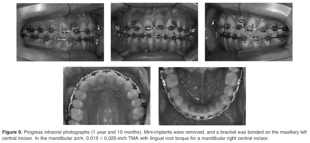 4. Alignment detailing (Figures 8 and 9). After 3 months of stabilization, this resin fixation was removed (Figure 8), and the maxillary left central incisor showed no mobility. A bracket was bonded on the maxillary left incisor, and a 0.018 3 0.022 stainless steel wire was engaged (Figure 9). Lingual root torque was applied on the mandibular right central incisor with a 0.019 3 0.025 TMA.
