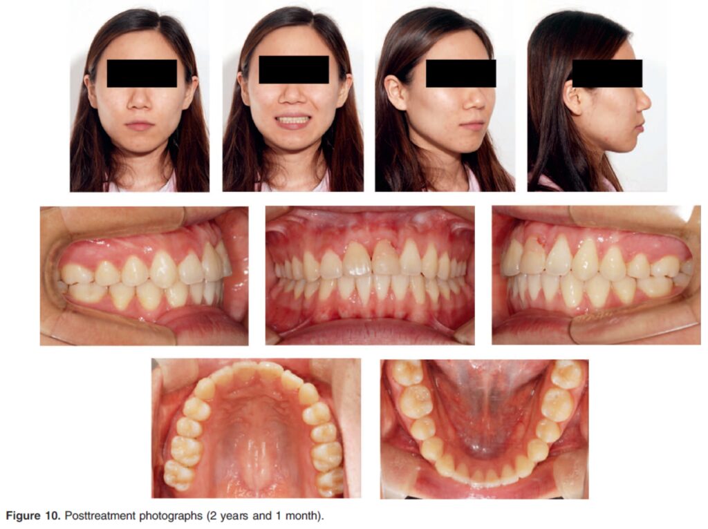 5. Debonding and retention (Figure 10). The brackets and bands were removed after 2 years and 1 month of active treatment. Circumferential maxillary and mandibular retainers were placed the day after debonding. At 14 months after retention, the maxillary and mandibular lingual fixed retainers were bonded because the patient wanted the fixed type. She was recommended for permanent retention.