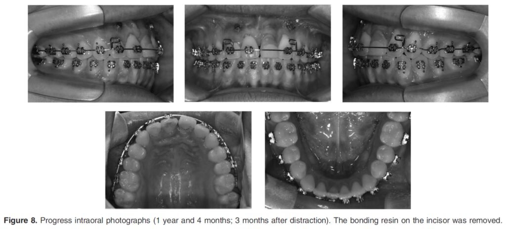7. Chang HY, Chang YL, Chen HL. Treatment of a severely ankylosed central incisor and a missing lateral incisor by distraction osteogenesis and orthodontic treatment. Am J Orthod Dentofacial Orthop. 2010;138:829–838.