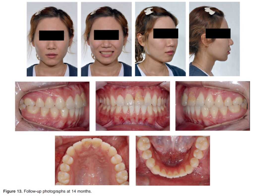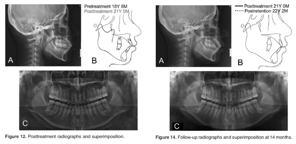 The patient’s facial profile slightly improved through retraction of the maxillary incisors with a satisfactory incisal display on smiling (Figure 10). The treatment concluded with Class I canine and molar relationships with adequate overbite and overjet (Figure 11). The posttreatment cephalogram showed the retraction of the maxillary incisors (Figure 12A,B). There was no significant root resorption (Figure 12C). The patient wore circumferential retainers 24 hours a day for the first 3 months, followed by a year of nighttime wear. The 14-month postretention stability was good (Figure 13). Cephalometric superimposition showed no significant dental or skeletal changes after debonding (Figure 14).