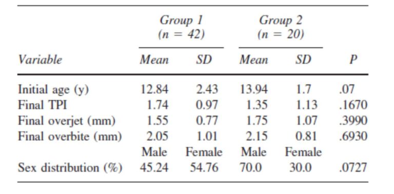 Class II Division 1 subjects having good orthodontic results with both treatment protocols—it follows that the groups would be occlusally compatible at their final stages. It was not believed that the groups should be statistically compatible at the end of treatment because some differences are always expected in the final cephalometric variables with these 2 treatment approaches. 1 But, in spite of different final cephalometric variables, the occlusal results in well-finished cases with these 2 approaches had to be similar. Table III shows that the groups were compatible because there were no statistically significant differences in the final TPI, overjet, and overbite. Despite apparent dissimilarities in sex distribution, the test of differences between percentages did not show a statistically significant difference between the groups.