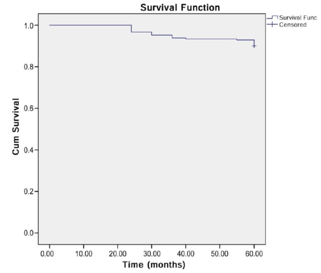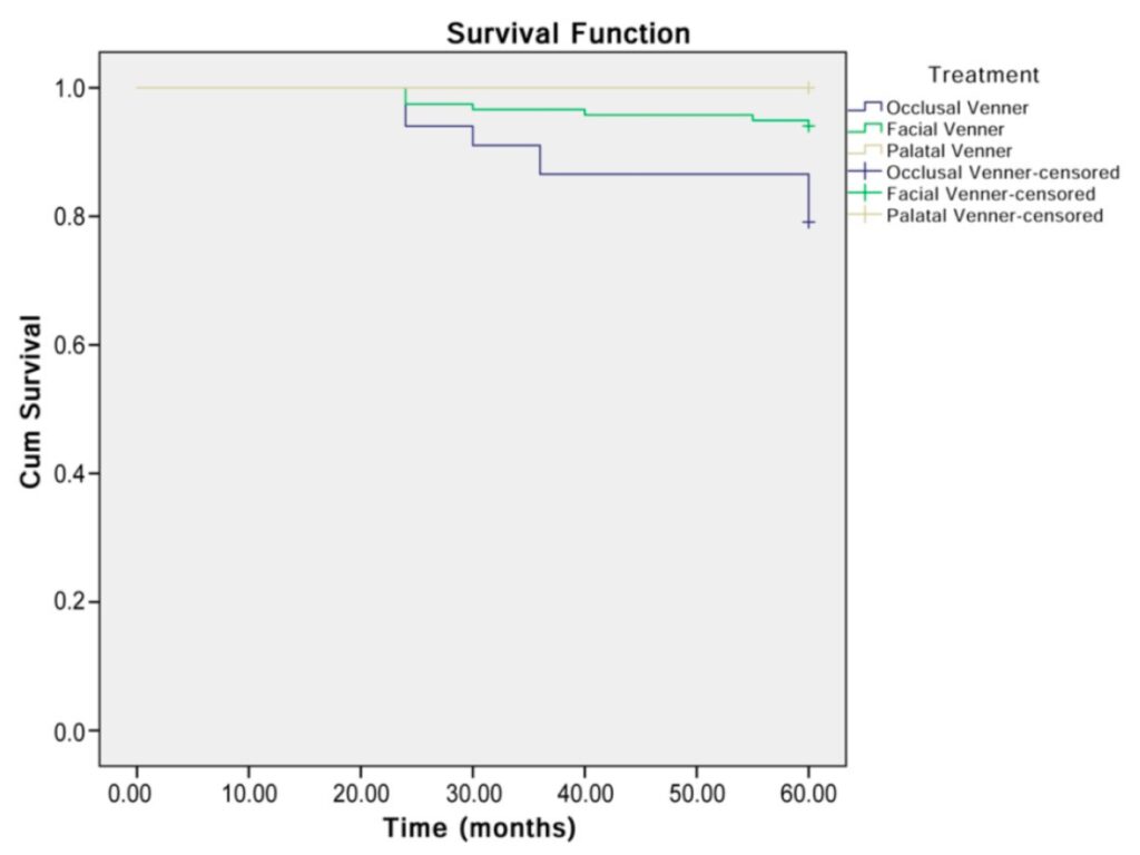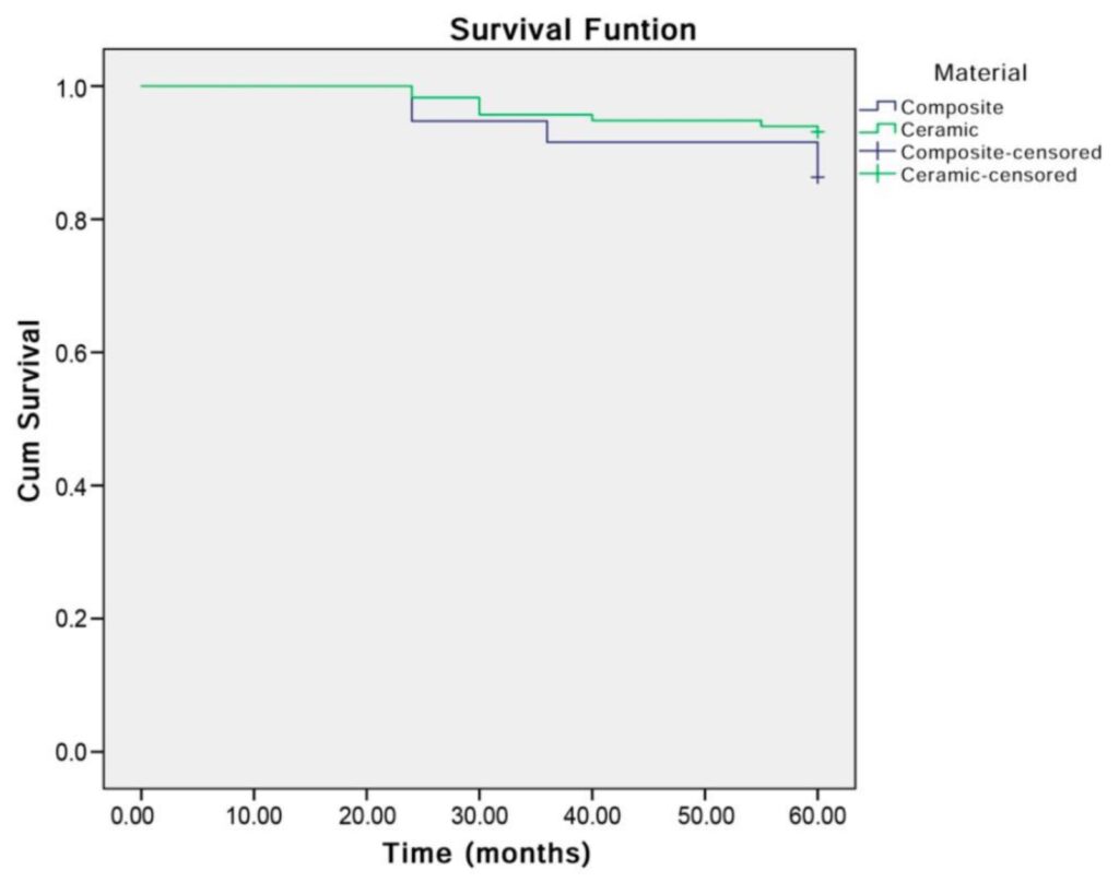 was 90.1% over 60 months of observation, with a survival time of 57.6 months. Only 21 restorations