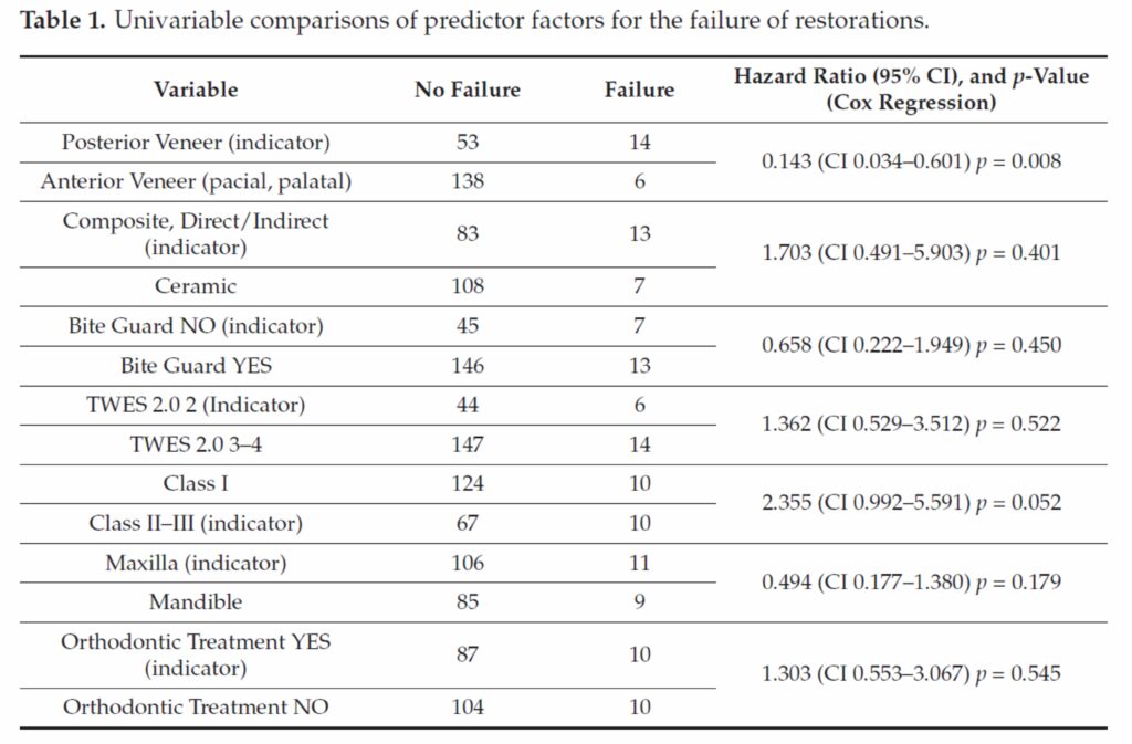 variables of the restoration type (posterior veneer, anterior veneer) and the type of restored tooth